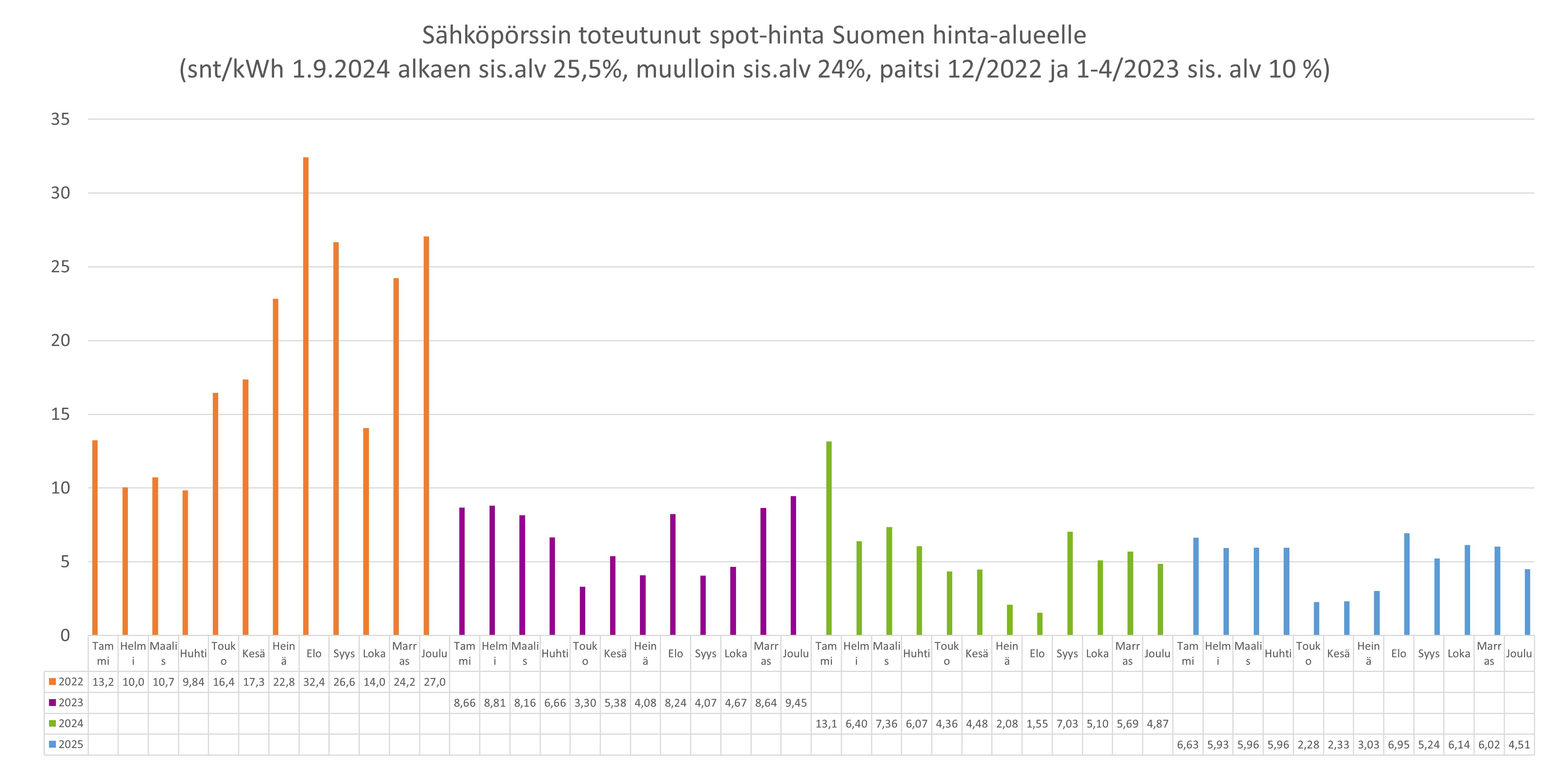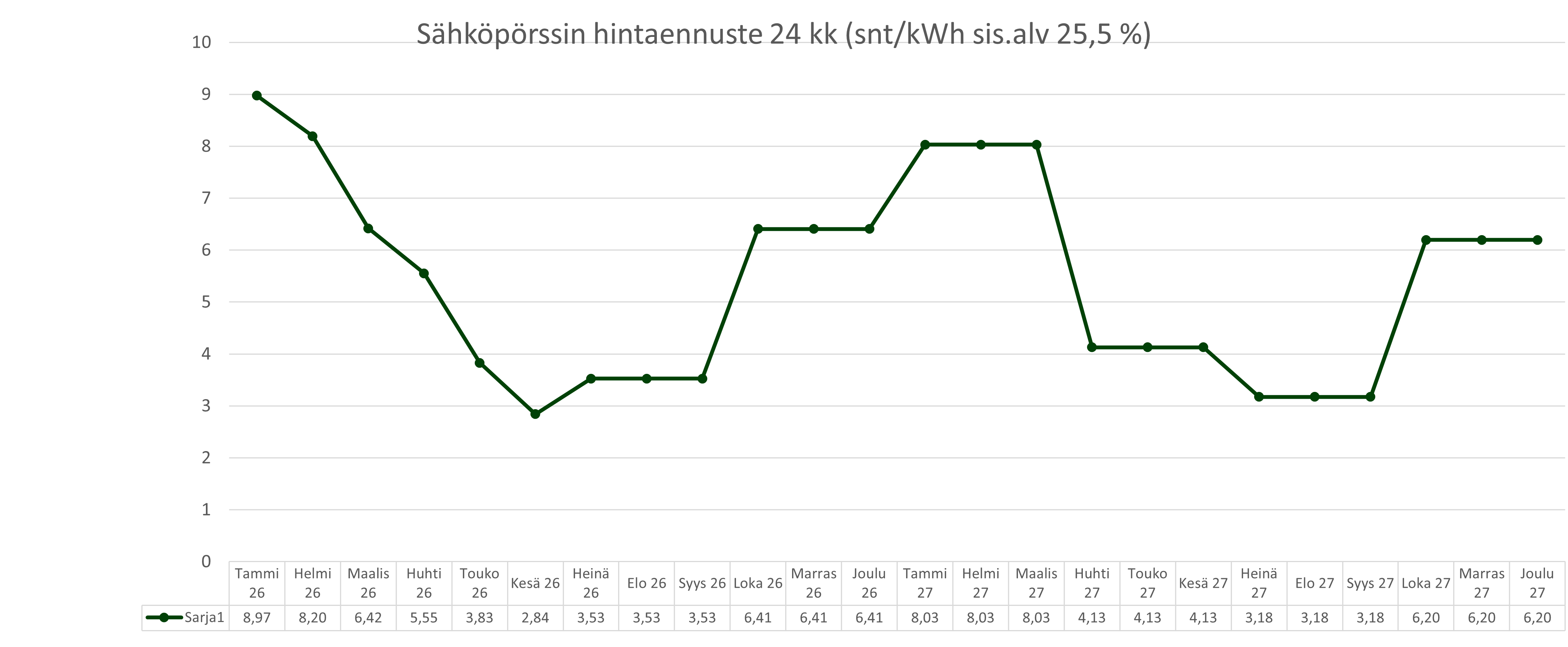 Tämän viikon spot-keskihinnan ennustetaan olevan noin 15 snt/kWh (sis. alv 25,5 %). Sääennusteet povaavat normaalia kylmempää ja vähätuulisempaa säätä, mikä nostaa hintaennusteita. Tänään maanantaina Suomen spot-hinta on keskimäärin n. 18,4 snt/kWh (sis. alv 25,5 %). Spot-hintojen ennustetaan pysyvän korkeina torstaihin asti. Perjantaina ja viikonloppuna hintojen arvioidaan painuvan hieman.