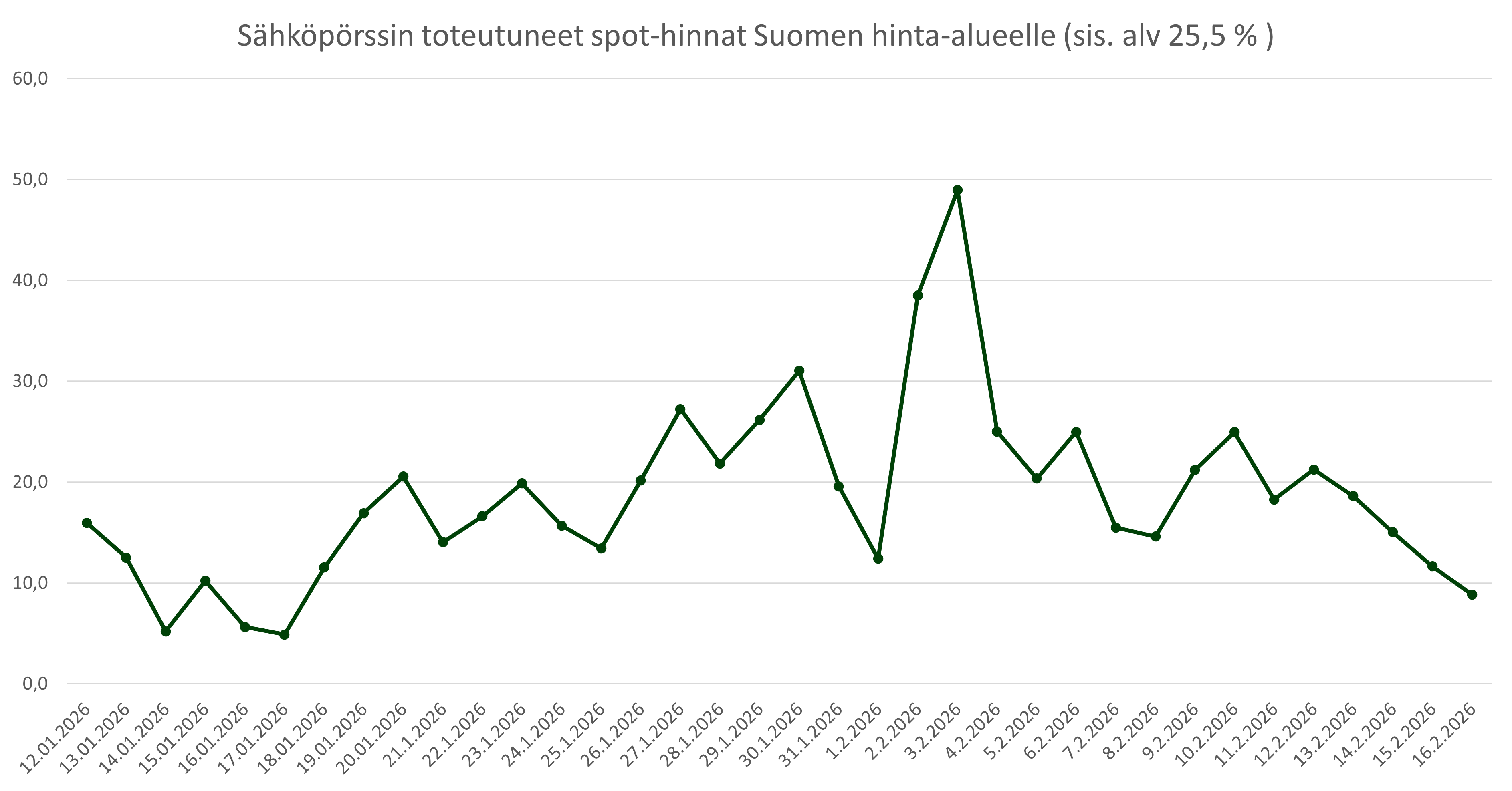 Kylmä sää ja vähäinen tuulivoimatuotanto ovat pitäneet spot-hinnat edelleen hyvin korkeina. Tällä viikolla pakkaset hieman hellittävät ja spot-hintojen ennustetaan laskevan.
