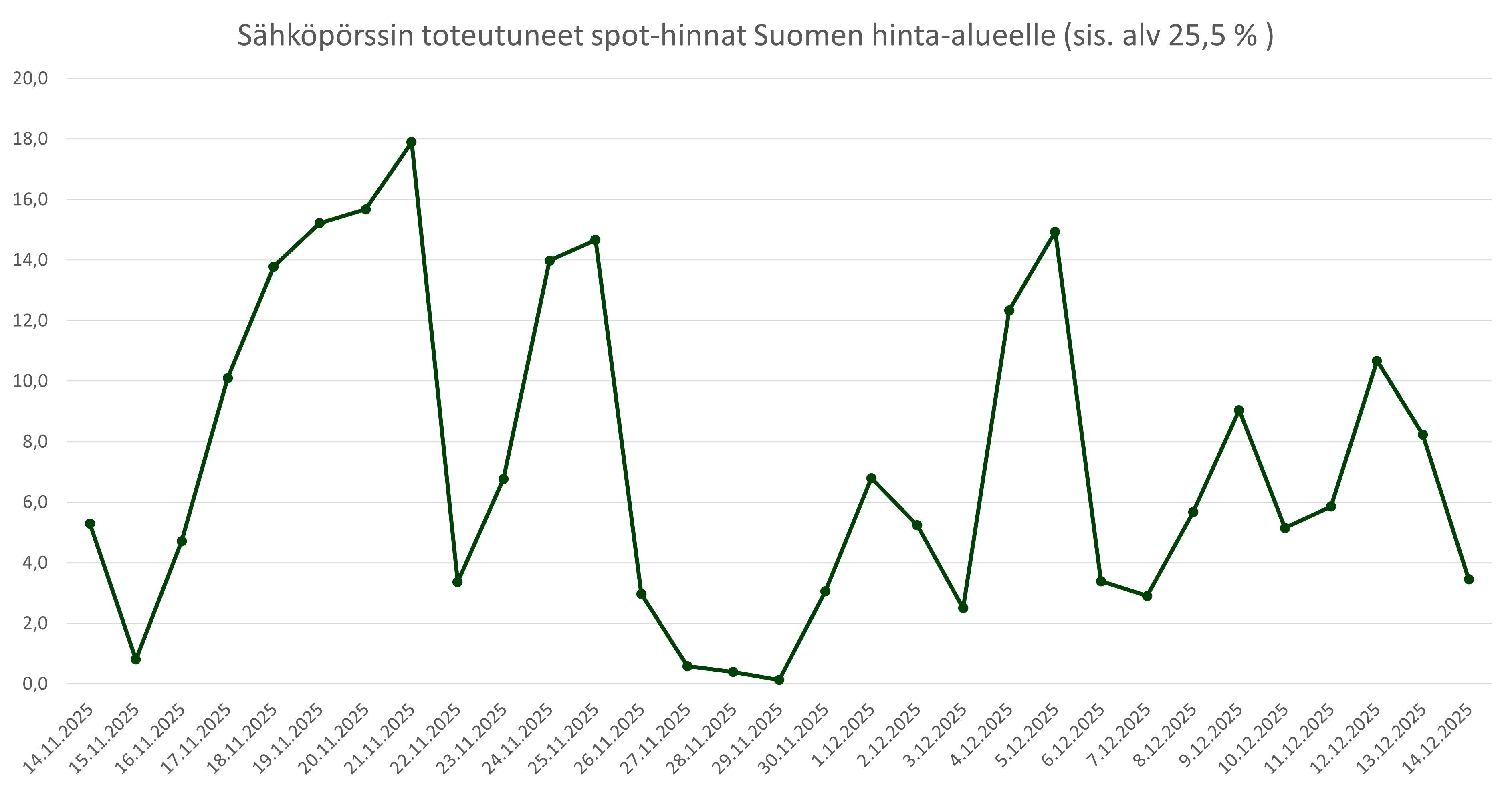 Tämän viikon spot-keskihinnan ennustetaan olevan noin 3 snt/kWh (sis. alv 25,5 %). Sääennusteet povaavat varsin tuulista ja lämmintä säätä koko viikolle, mikä pitää hintaennusteet hyvin maltillisina.